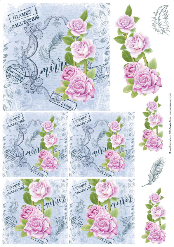 A folhe é composta por 5 estampas arte francesa quadradas, sendo uma imagem no tamanho de 13x13 cm e 4 no tamanho de 8x8 cm e imagens avulsas variando o tamanho entre 6 e 11 cm (na maior medida) dependendo da estampa.