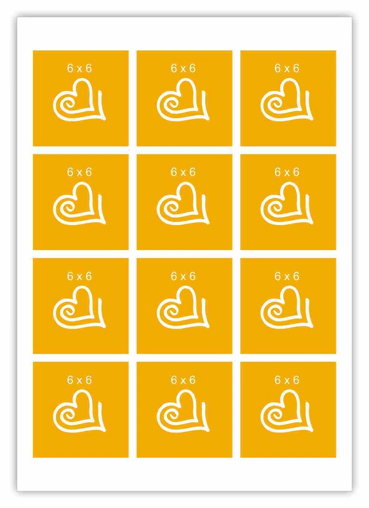 Você deve escolher o formato entre redondo ou quadrado, e o tamanho da imagem pela grade de medida por folha.